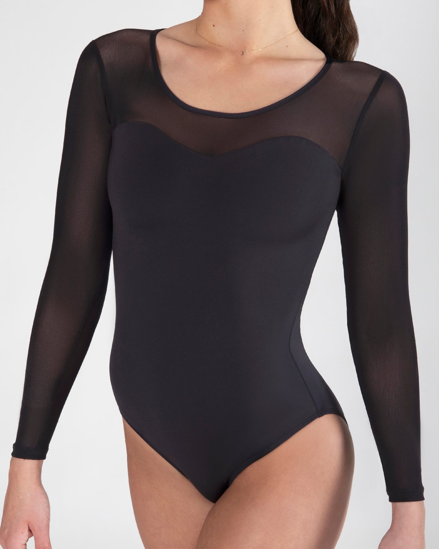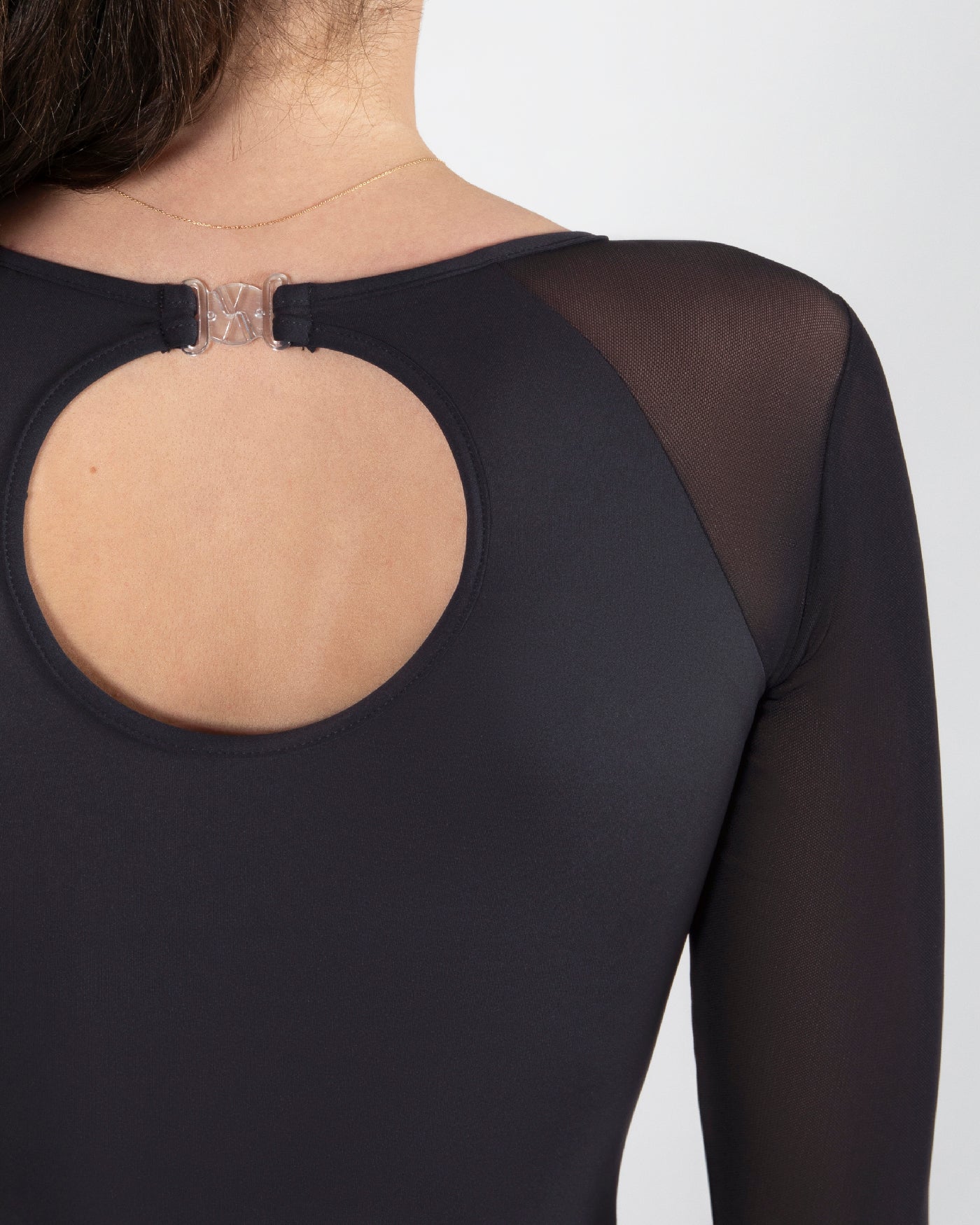 - Long Tech Mesh sleeves enhance your classical arm lines.