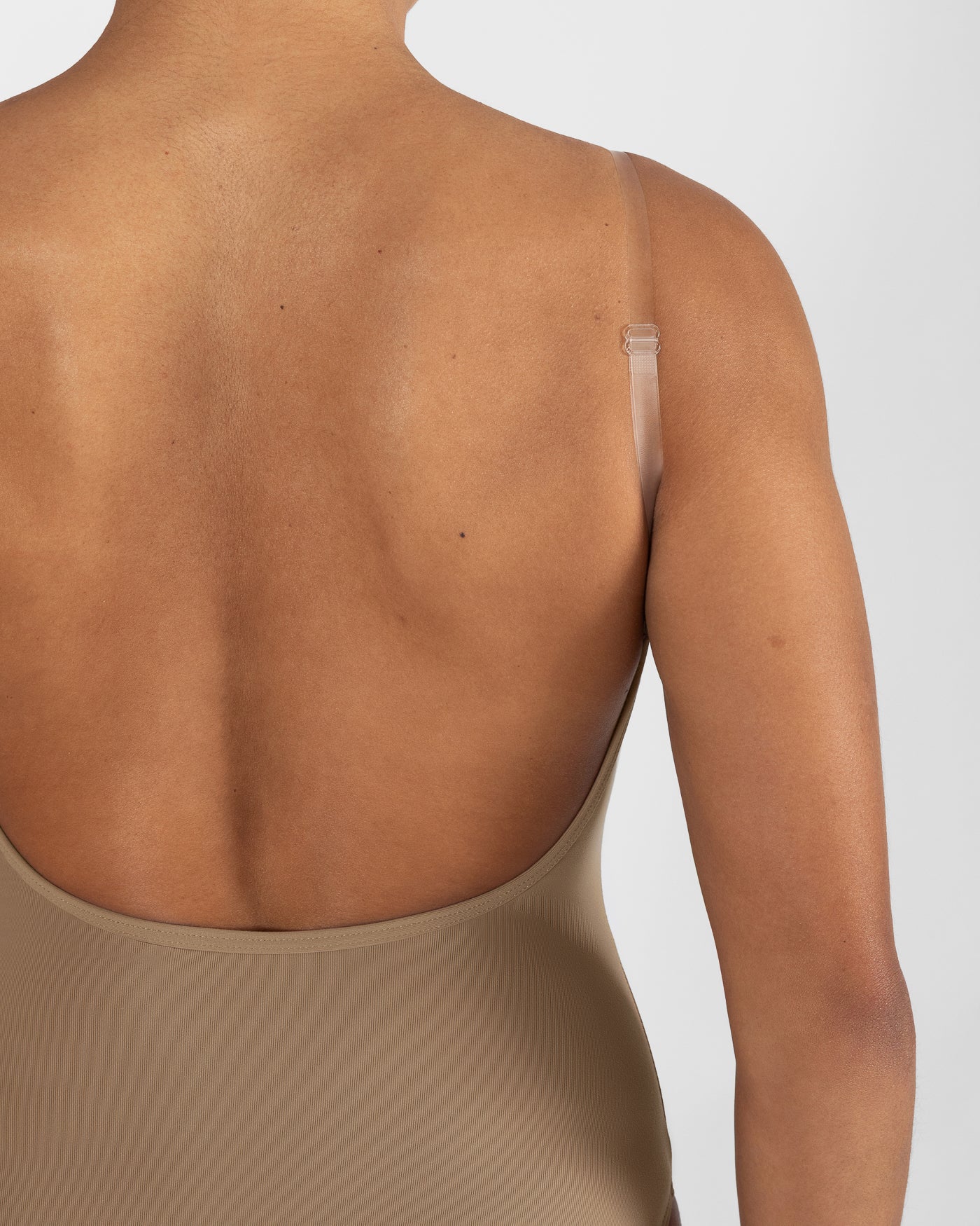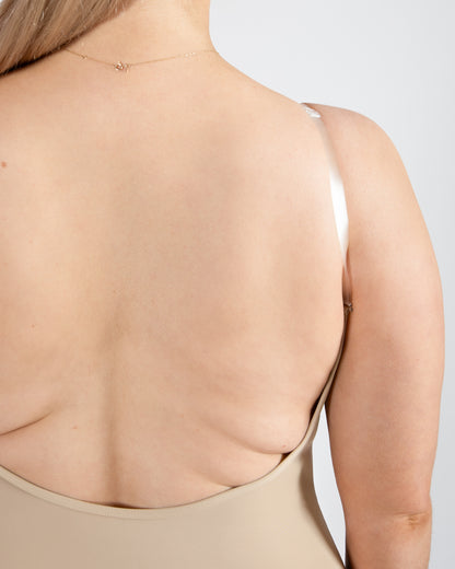 - Low back and adjustable clear straps for added versatility