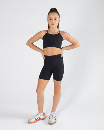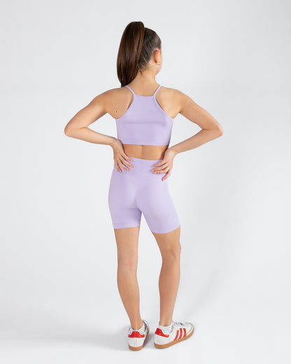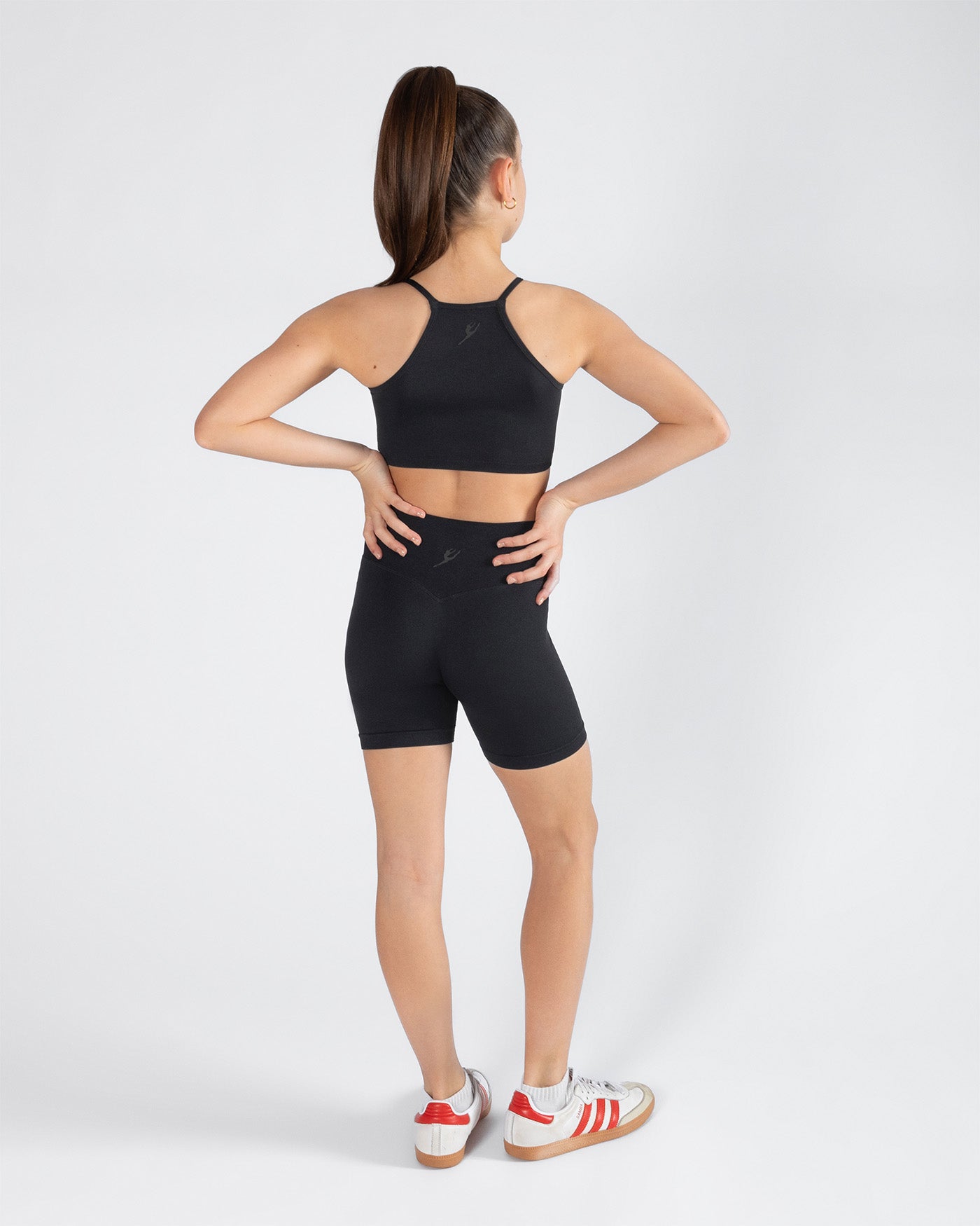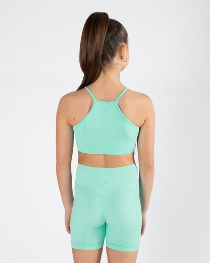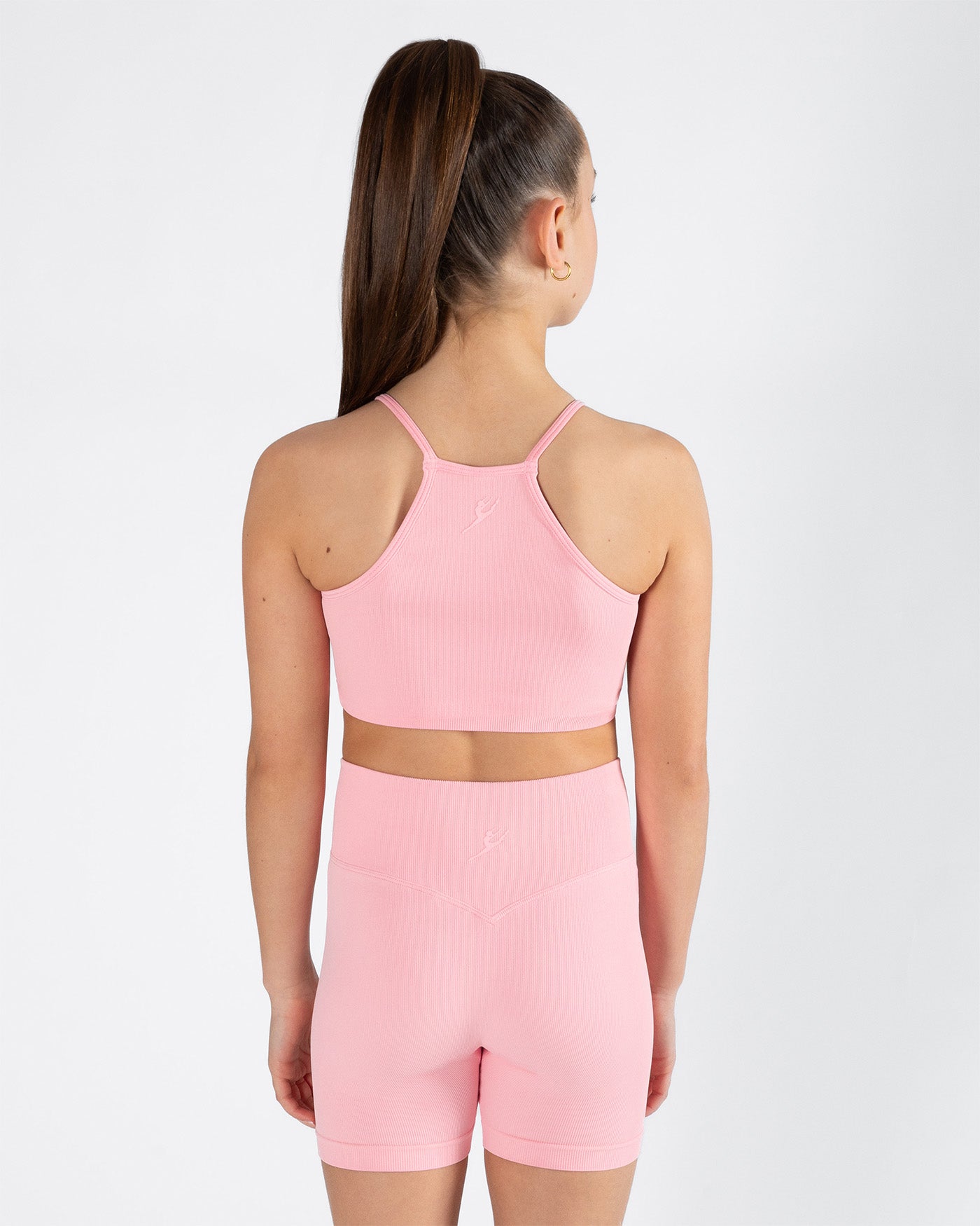 High neckline and racerback design for a modern, athletic look